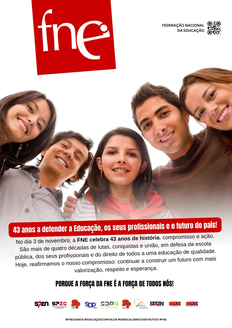No próximo dia 3 de novembro, a Federação Nacional da Educação (FNE) celebra 43 anos de história, compromisso e ação. São mais de quatro décadas de trabalho em defesa da educação, da valorização dos seus profissionais e da dignificação de todos os que fazem da escola o coração do país.