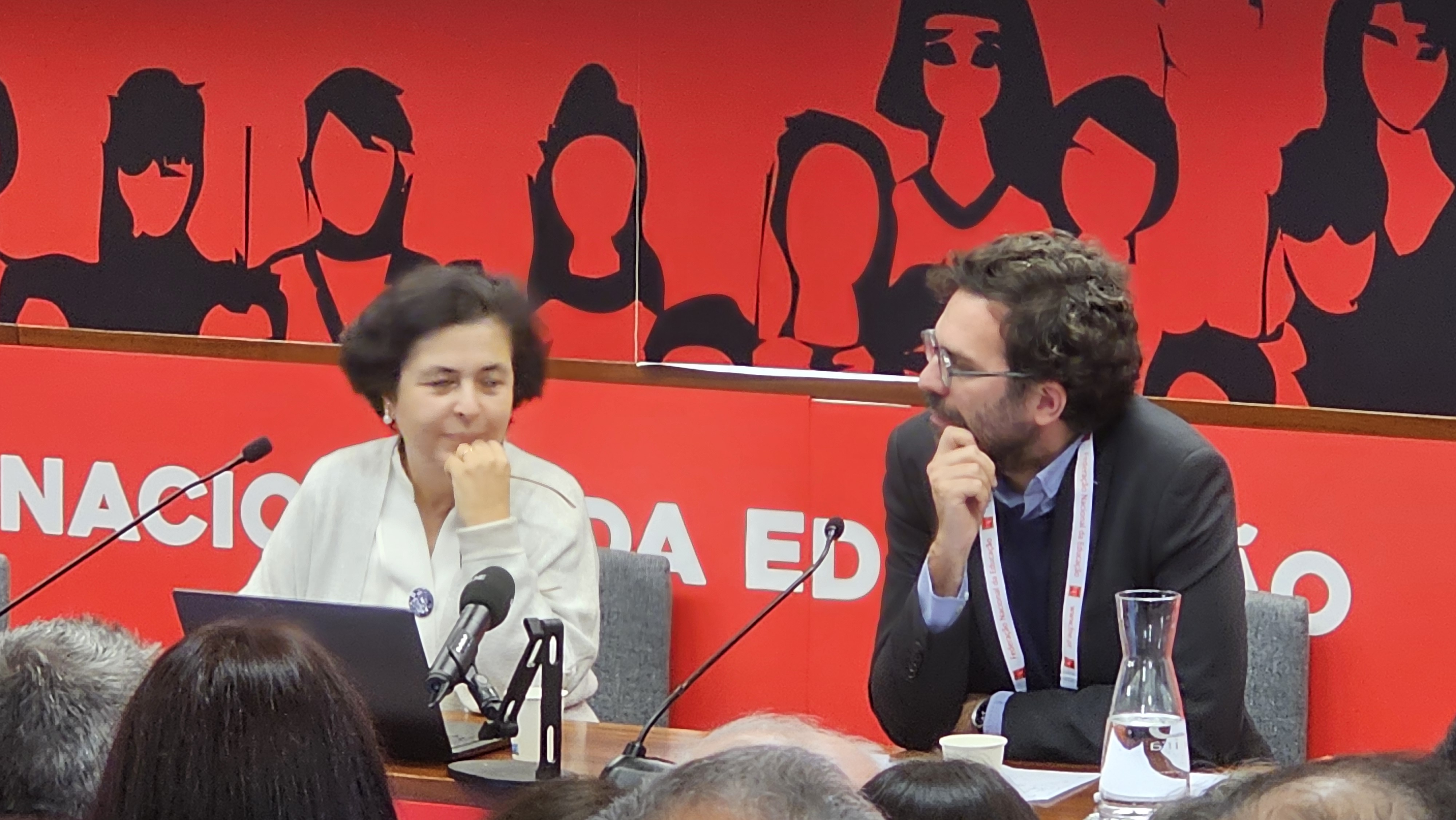 Pelas 11h30 deu-se início ao “Olhar sobre o sistema educativo português”, numa apresentação conjunta de Pedro Freitas, investigador associado da Universidade de Oxford, e Ana Balcão Reis, Professora da NOVA SBE. A Professora da NOVA SBE começou por se referir a quem são os alunos e quem são os professores, nomeando duas grandes melhorias em Portugal: a taxa de alfabetização (que melhorou imenso nas últimas décadas, logo: pais mais alfabetizados) e o abandono escolar precoce.